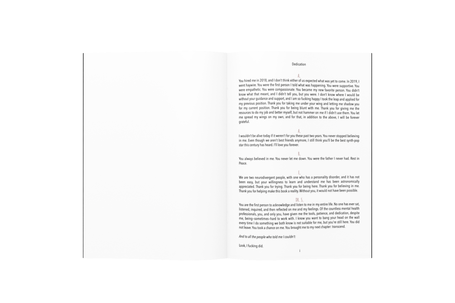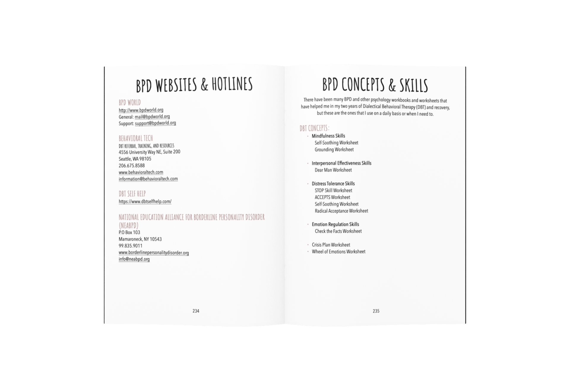 Book of Thoughts is a 300+ page compilation of poems, journal entries, and artwork about a young girl's personal experience living with Borderline Personality Disorder and other mental illnesses.